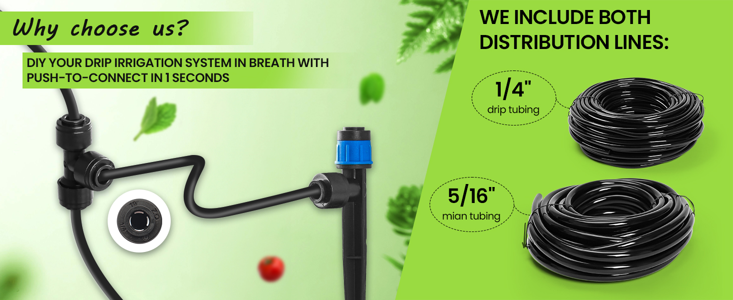 - 🚀 Quick-to-Connect Drip Irrigation System – No More Hassle! Tired of struggling with traditional drip irrigation setups? Our garden watering system features an innovative Push-to-Connect design, allowing you to install the drip line irrigation system effortlessly. Just press, insert, and pull back—no heating or extra tools needed! Secure leak-proof connections in seconds, making garden watering easier than ever.