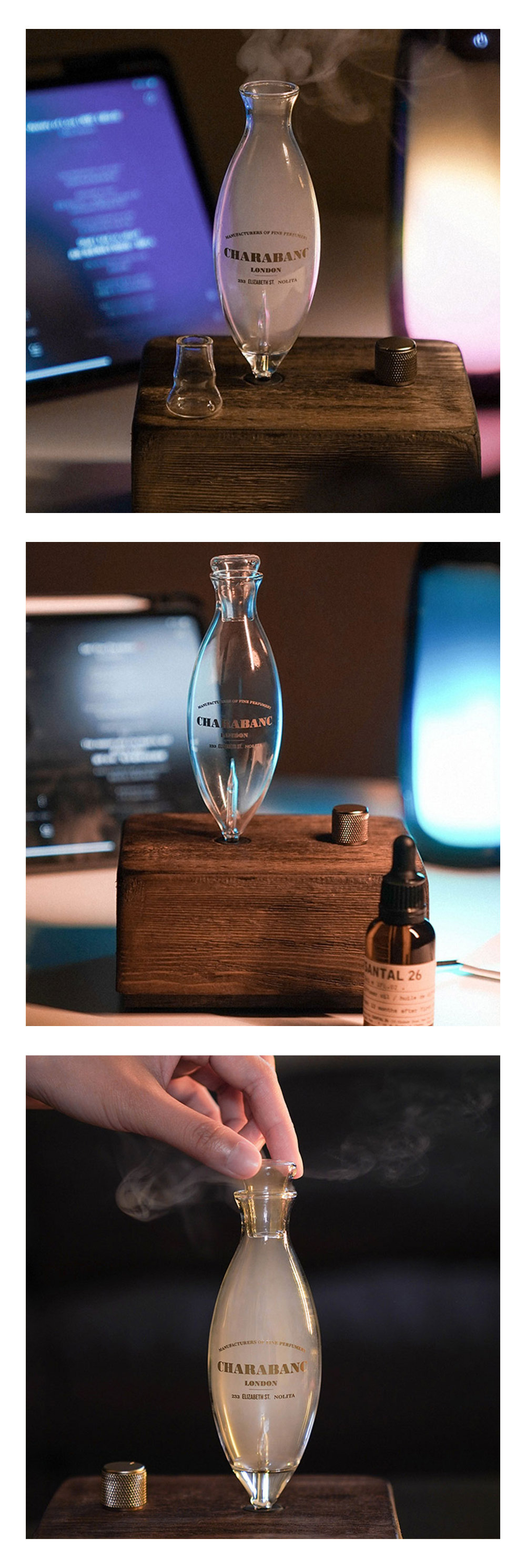 housed in an elegantly crafted natural wood base. This diffuser is a perfect blend of modern technology and vintage charm, making it a