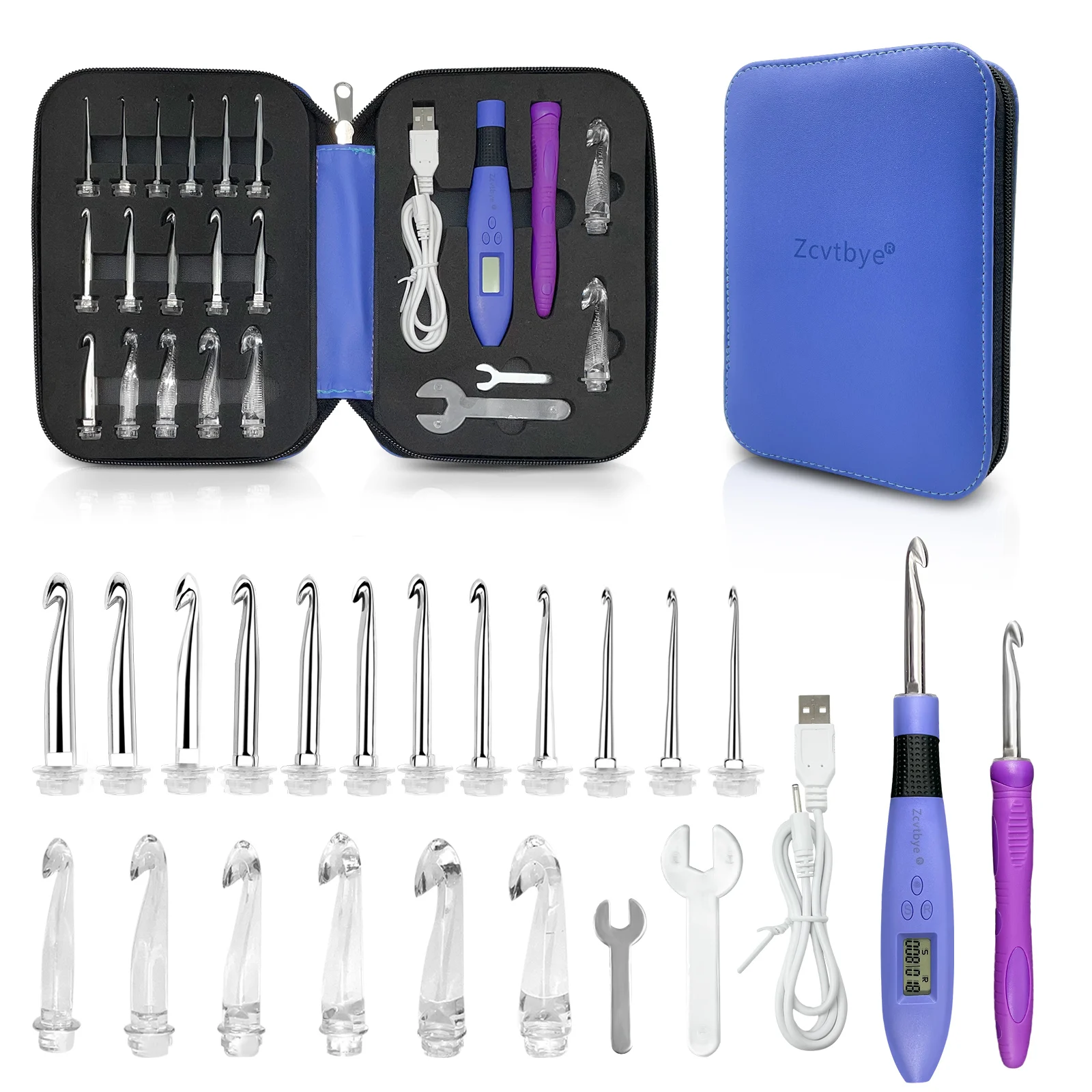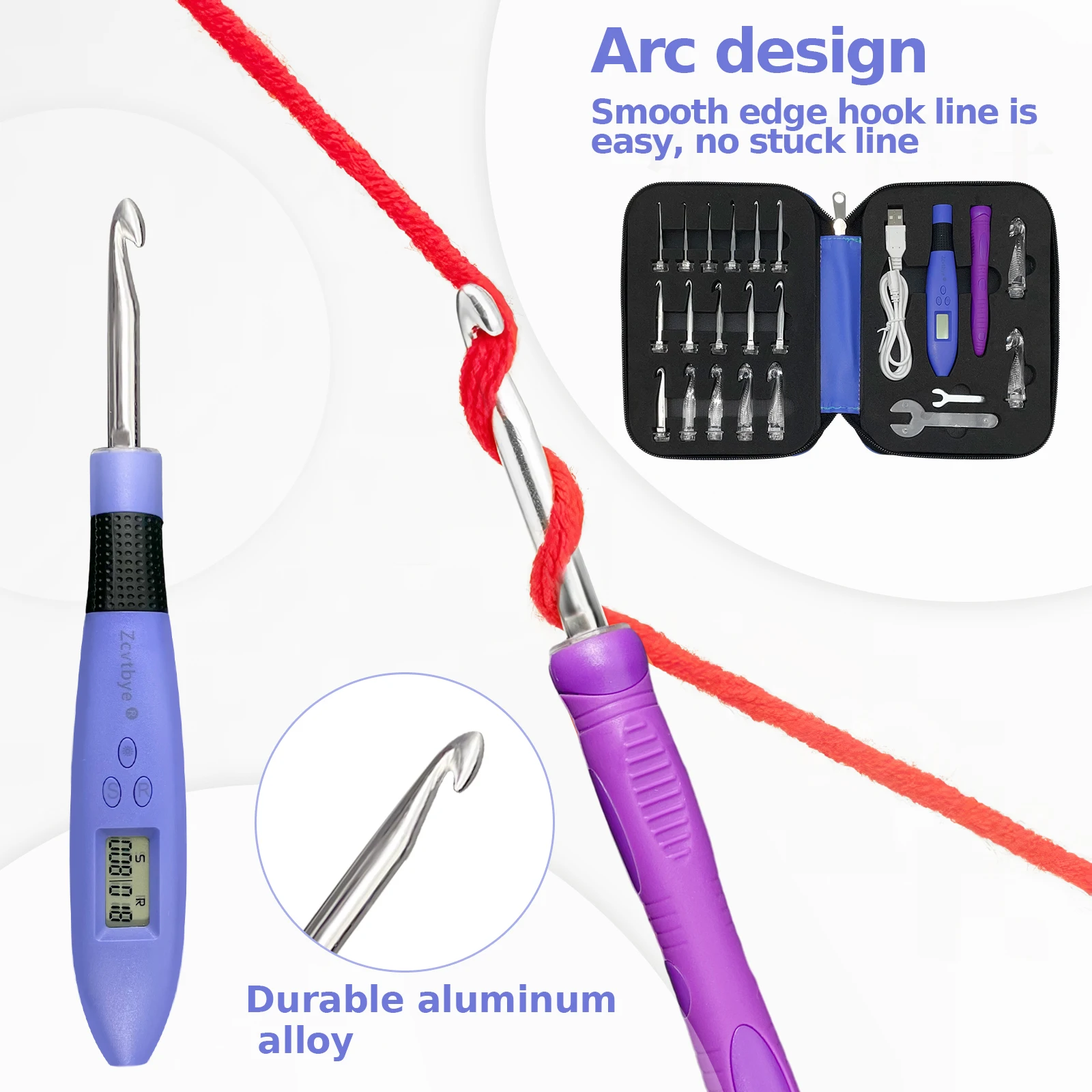 Counting Crochet Hook Set with Case,18 Size Metal Interchangeable Heads,Rechargeable Lighted Crochet Hook with Stitch and Row Counter Ergonomic Handle,Gift for Beginner Knitting Enthusiasts