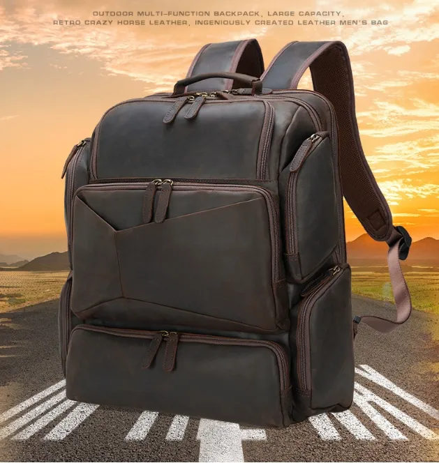 Embark on your adventures with the Vintage Travel Genuine Leather 17-Inch Outdoor Large Capacity Crazy Horse Computer Backpack. This