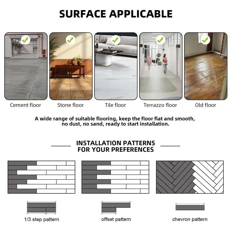 Flexible Installation Methods: Available in planks, tiles, or sheets with click‑lock, glue‑down, or loose‑lay options.