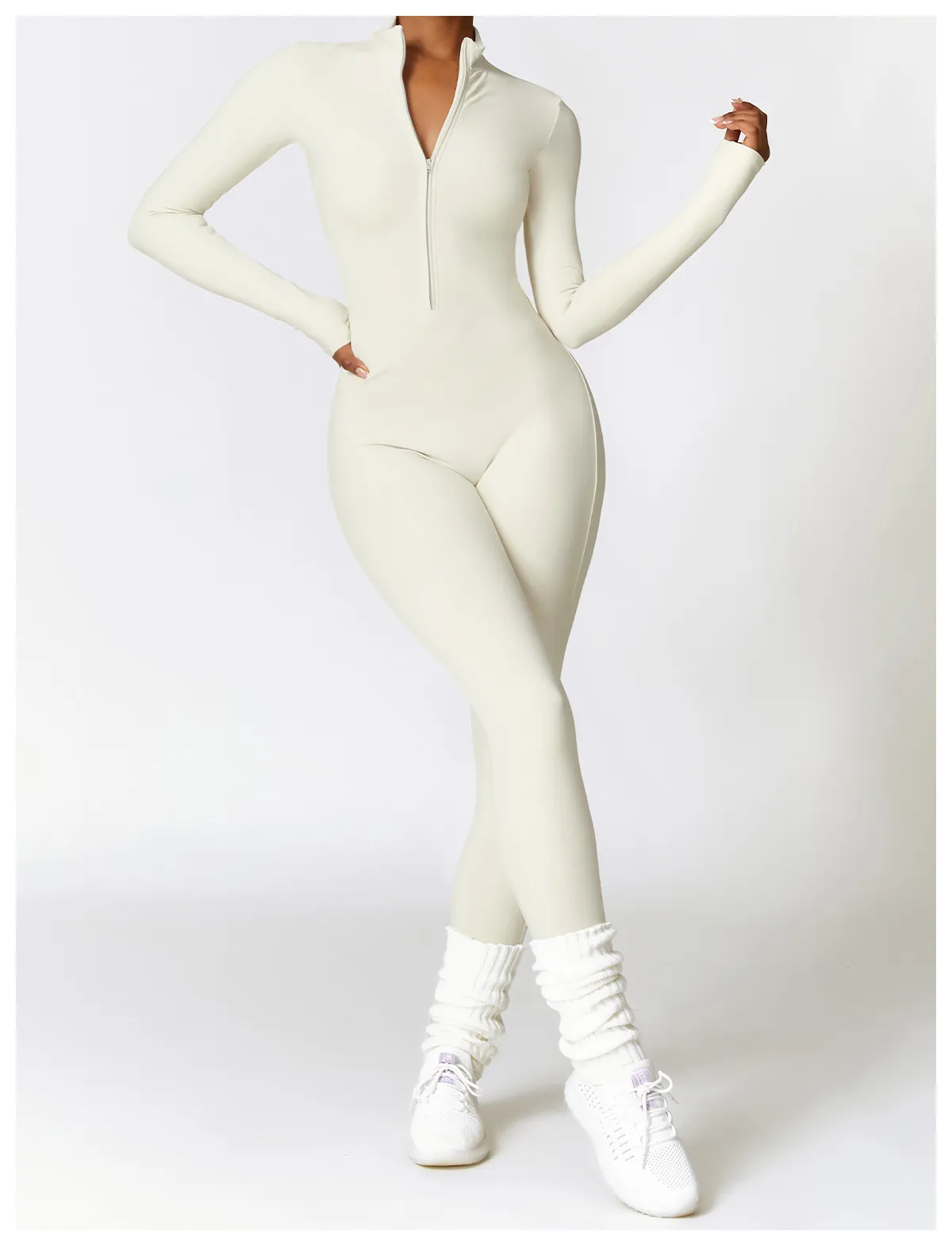The long-sleeved jumpsuit is designed to seamlessly transition from fitness activities to casual outings. Its streamlined silhouette and chic zipper detail make it a standout piece, whether you're in a yoga studio, on a morning run, or enjoying coffee with friends.