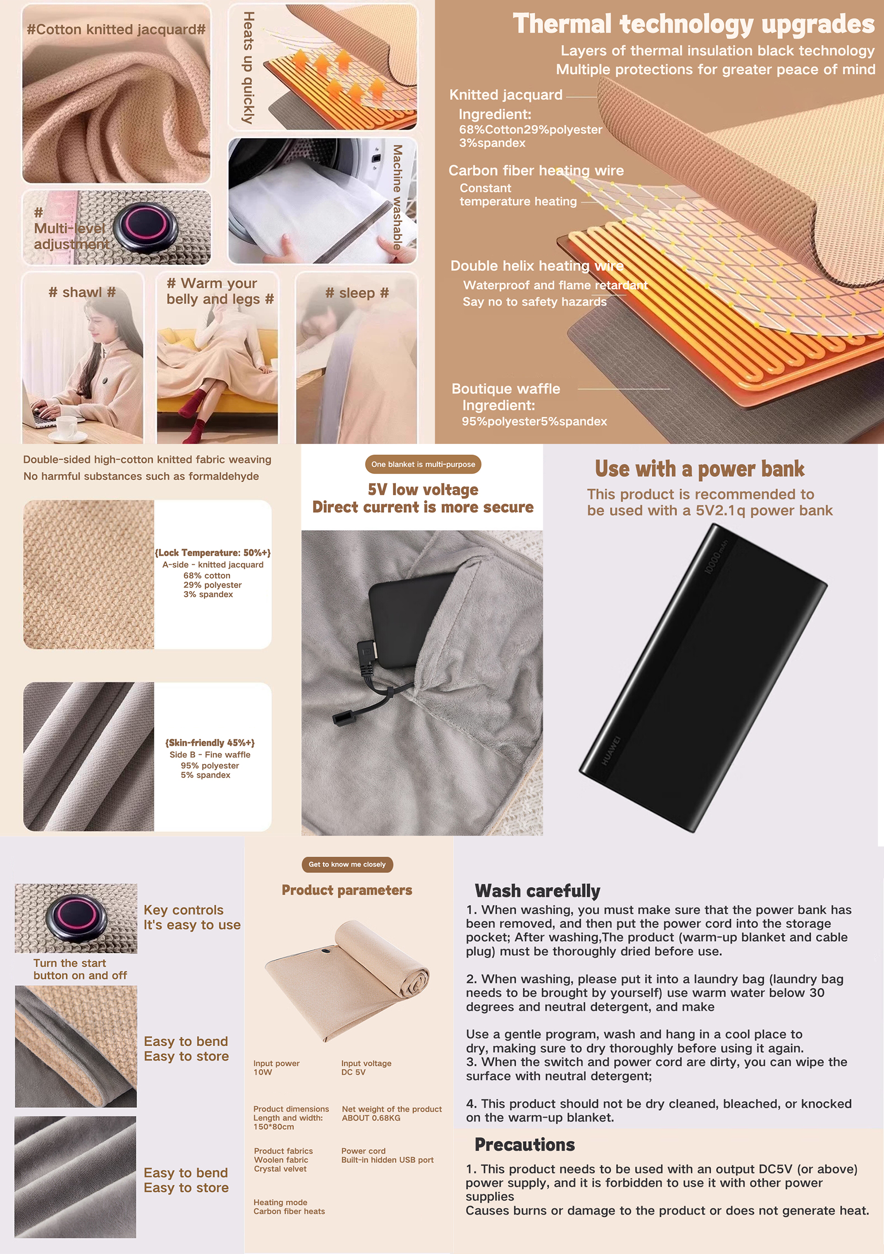 - 【Machine Washable】The switch and heater of our heated blanket throw are waterproof, you can wash it in the washing machine. (Please insert the USB cable into the pocket and wash the blanket in the laundry bag)