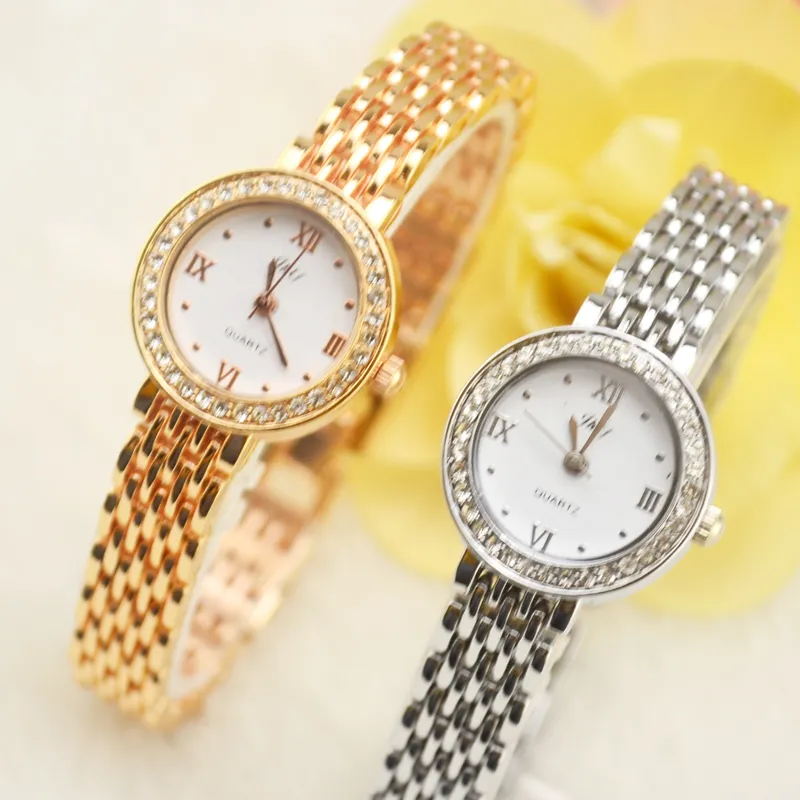 The watch face and bezel are embellished with high-quality rhinestones that catch the light beautifully, creating a luxurious and eye-catching sparkle.