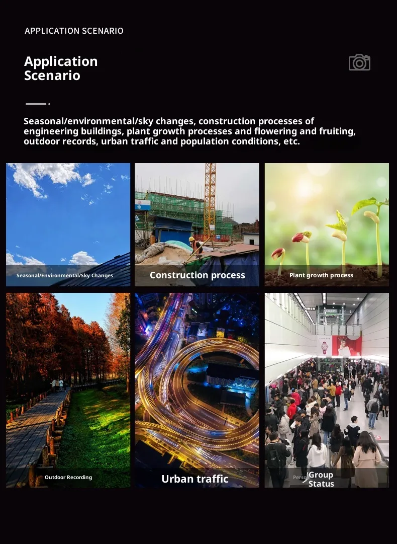 Powered by a high-capacity rechargeable battery, the camera provides hours of continuous operation. For long-term time-lapse projects, it supports external power input or solar charging (model-dependent), ensuring non-stop performance for days or weeks.