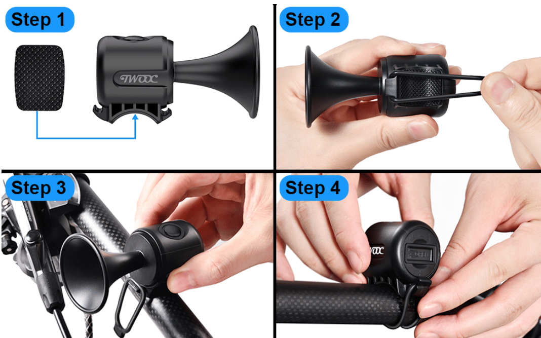 Package Includes: 1* Electric Horn, 1* Manual, 1* anti-slip Pad, 2* Silicone Strap, 2* Battery