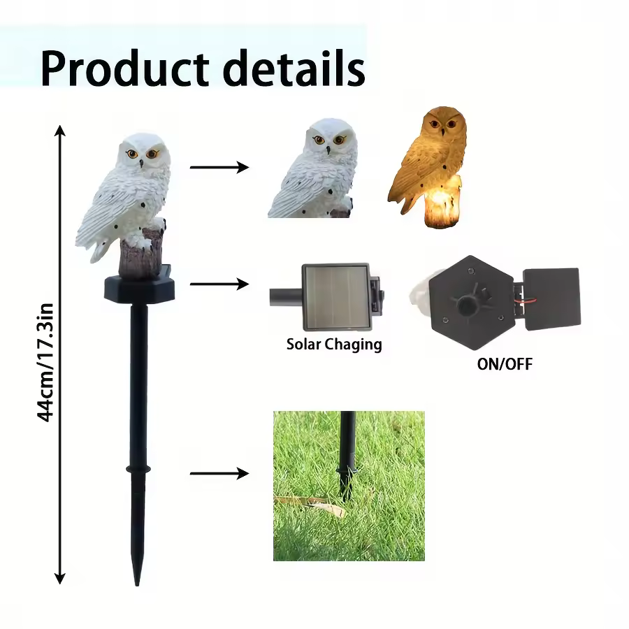 Equipped with smart light sensors, the owl automatically turns on at dusk and powers down at dawn, offering hassle-free convenience.