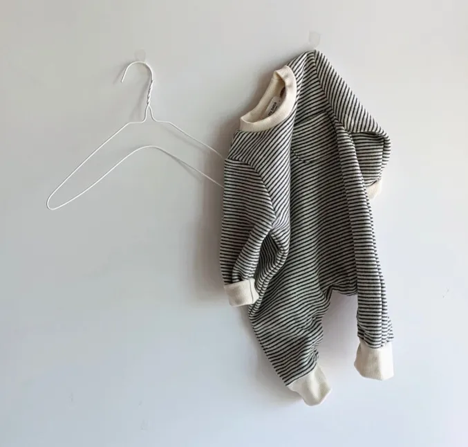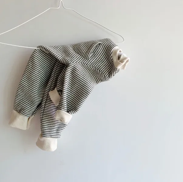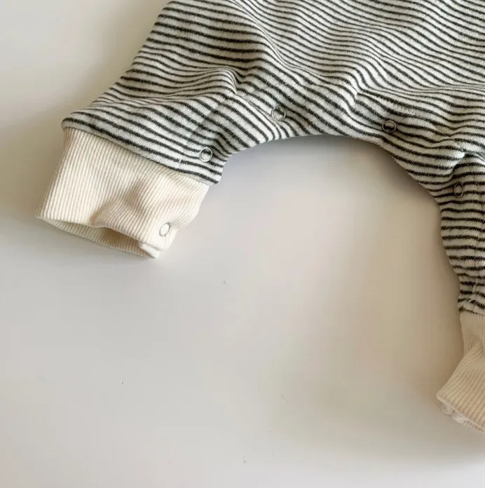 The jumpsuits feature a classic striped pattern, giving them a stylish and timeless look suitable for boys and girls alike. The easy-to-wear design includes snap buttons or a convenient zipper closure, making it simple for parents to dress and change their baby without hassle. The loose fit allows for freedom of movement, ensuring your baby stays cozy and happy as they explore the world around them.