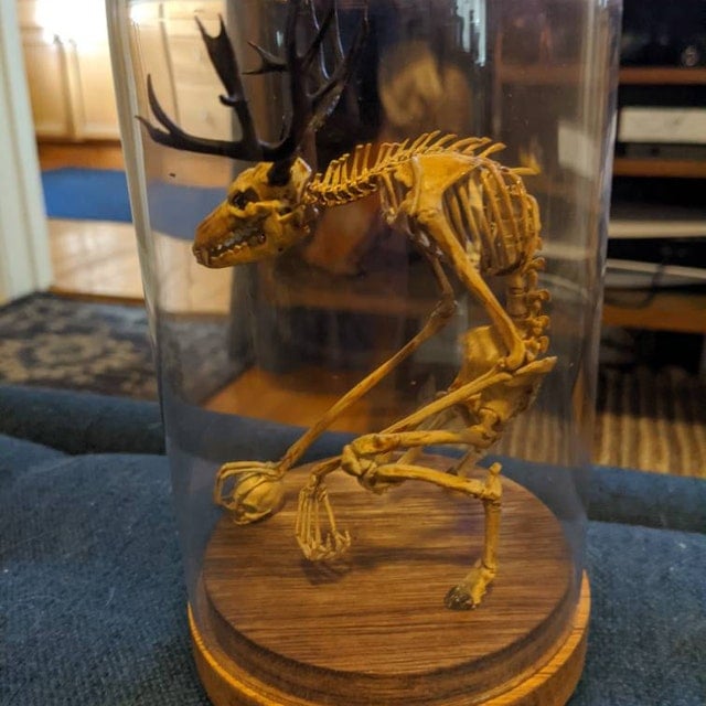 This piece is a digitally sculpted and printed replica of an Wendigo skeleton inside a dome for your curiosity cabinet or just