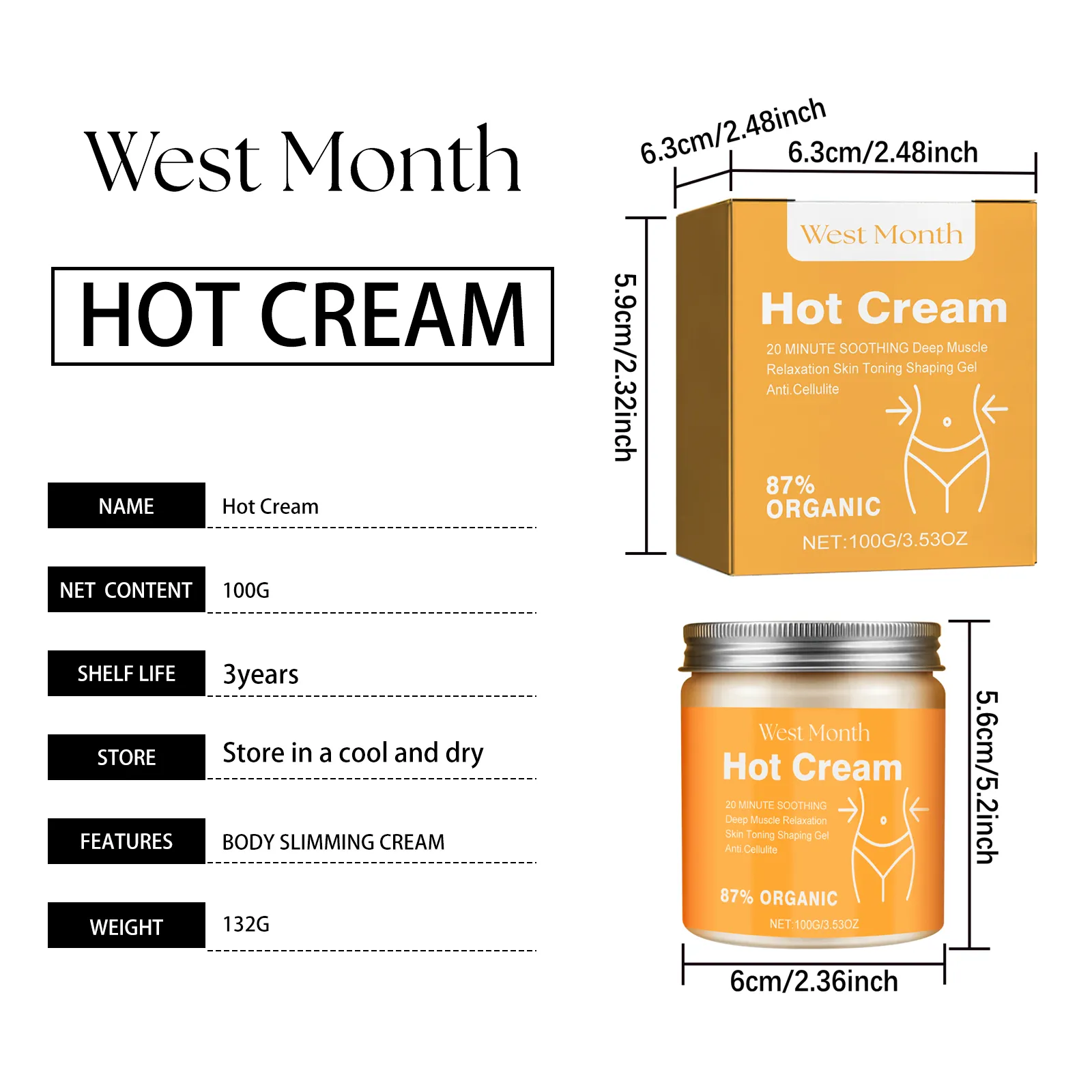 Sculpt your body and smooth away cellulite with the West Month Hot Cream. This deeply soothing and effective cream is designed to enhance your body's shape while offering muscle relaxation and skin toning. Infused with 87% organic ingredients, this hot cream activates heat upon application, promoting blood circulation, reducing the appearance of cellulite, and supporting the body's natural contouring process.