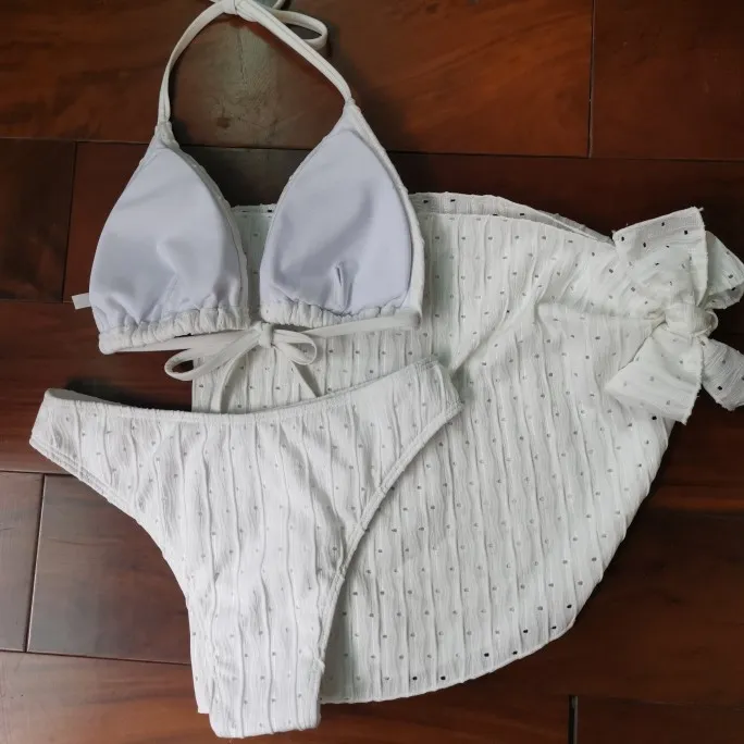 The White Three-Piece Bikini Mesh Cover Skirt is the perfect accessory for a variety of beach and poolside activities. Whether you're planning a beach day with friends, attending a pool party, or heading out for a beach holiday, this cover-up adds an extra layer of glamour to your swimwear. The white color adds a clean, fresh look that pairs beautifully with any bikini or swimsuit, while the lightweight mesh fabric ensures you stay cool and comfortable as you enjoy the summer weather. With its chic design and practical functionality, this three-piece set is a must-have for your beachwear collection.