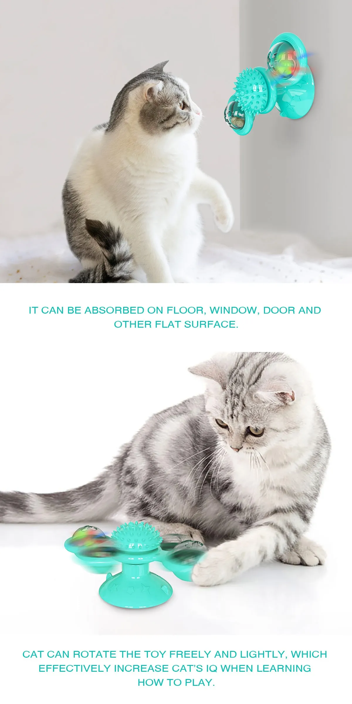 Stick It & Let It SPIN!Find a nice flat surface, stick the Fidget Spinner Windmill Cat Toy suction cup. It can be placed on a door, wall, tub, and floor. |