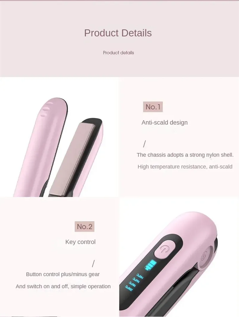Say goodbye to tangled cords and limited movement. The wireless design of this straightener allows you to style your hair wherever you are, whether you're at home, in the car, at work, or even while traveling. The USB charging capability makes it easy to charge via power banks, laptops, or USB adapters, so you can always keep it ready for use.