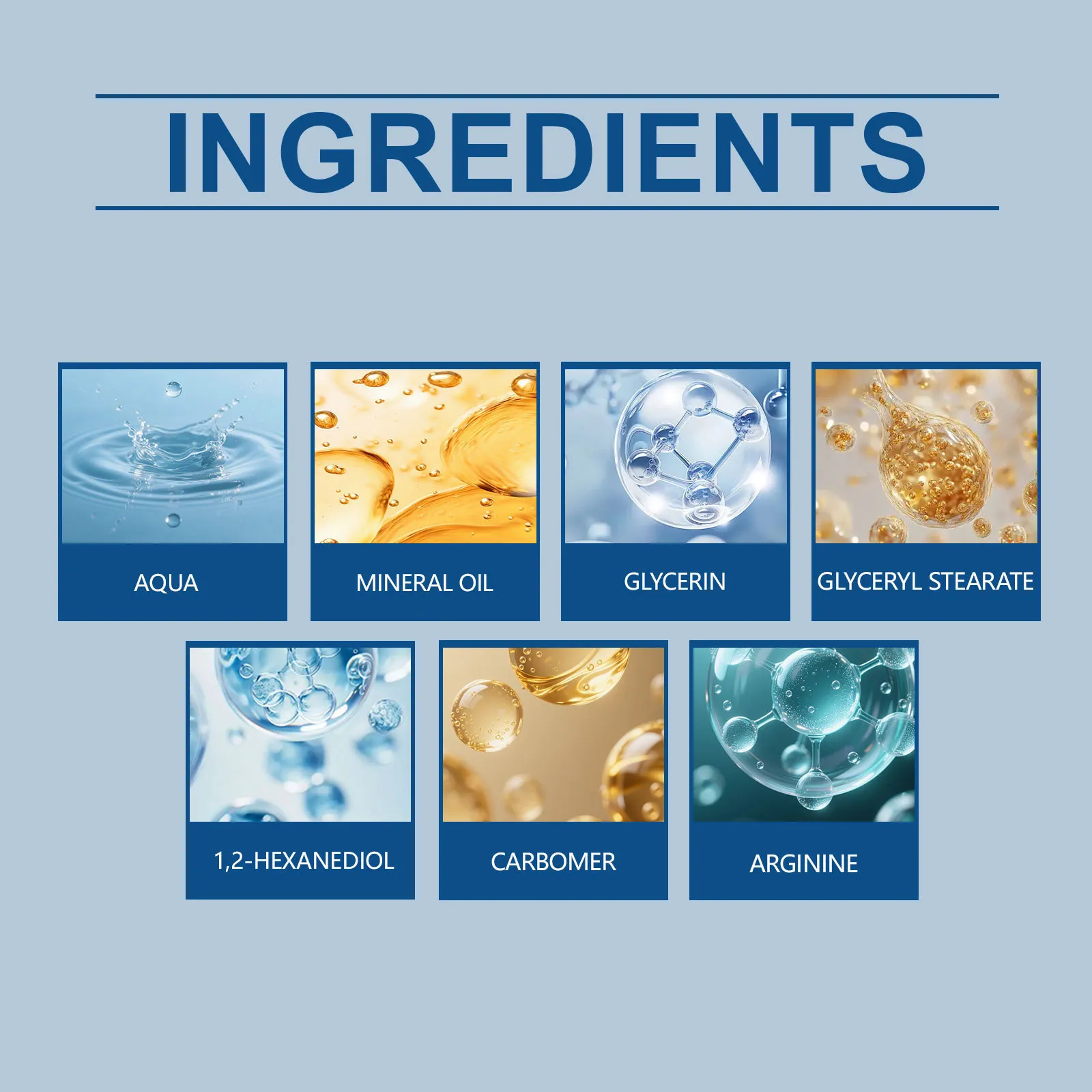 Ingredients: water, mineral oil, glycerol, glycerol stearate, 1,2- hexanediol, carbomer, arginine.