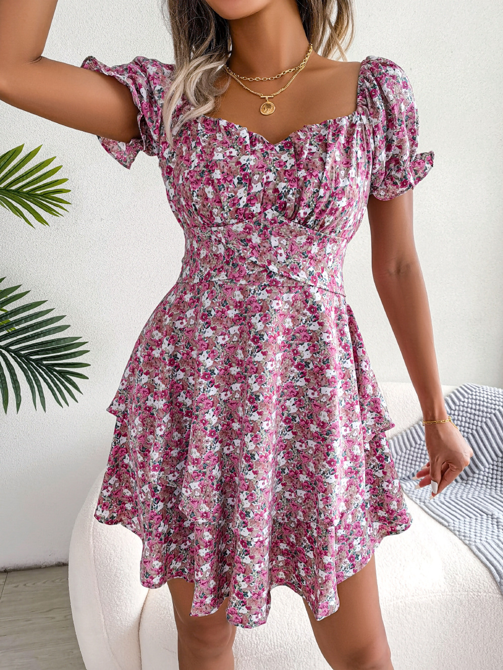 Women Mini Dress Temperament Big Swing Loose Hem Flower Print Shirring Dress Up Short Sleeves High Waist Summer Dress Clothes
