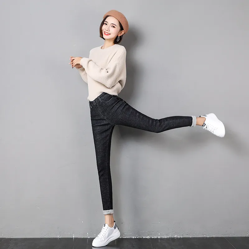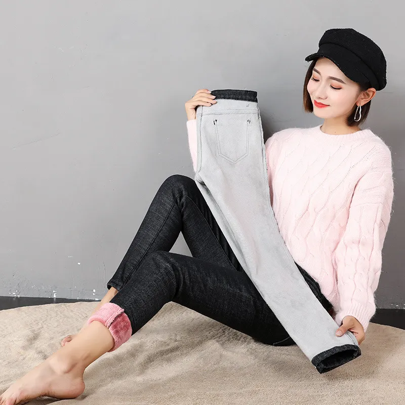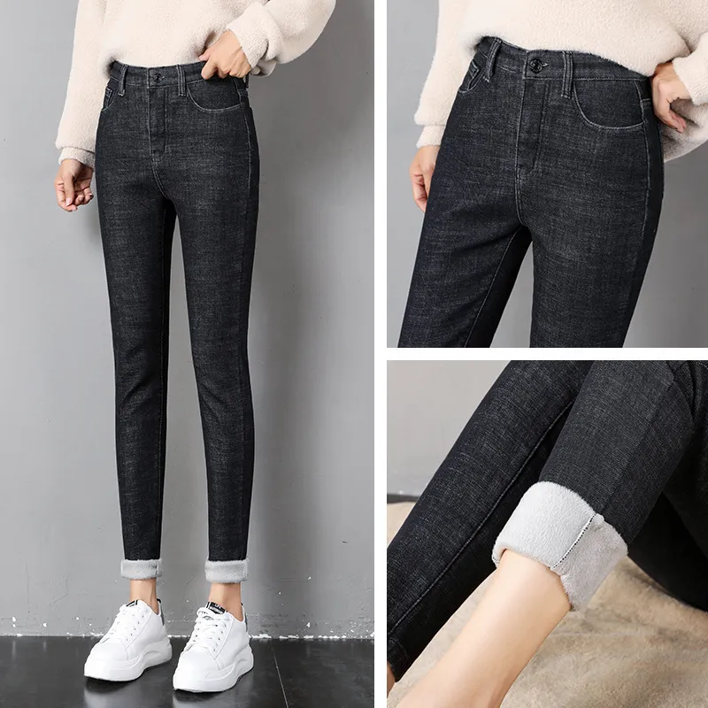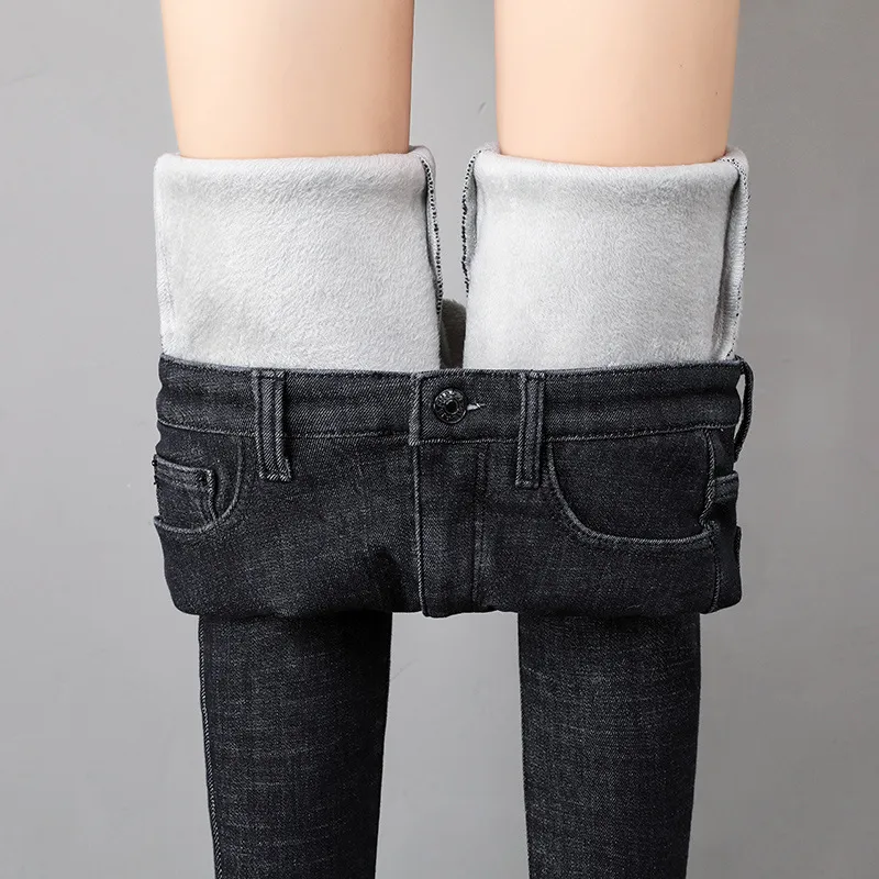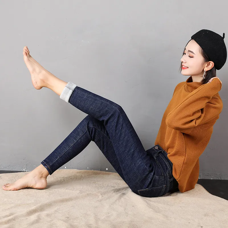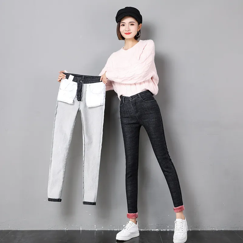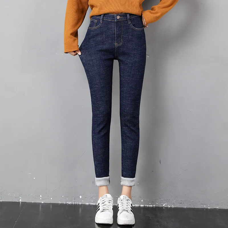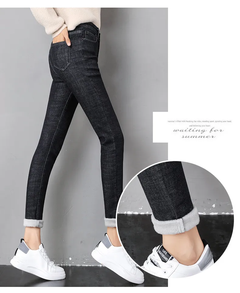 Women Thermal Jeans Winter Snow Warm Plush Stretch Jeans Lady Skinny Thicken Fleece Denim Long Pants Retro Blue Pencil Trousers