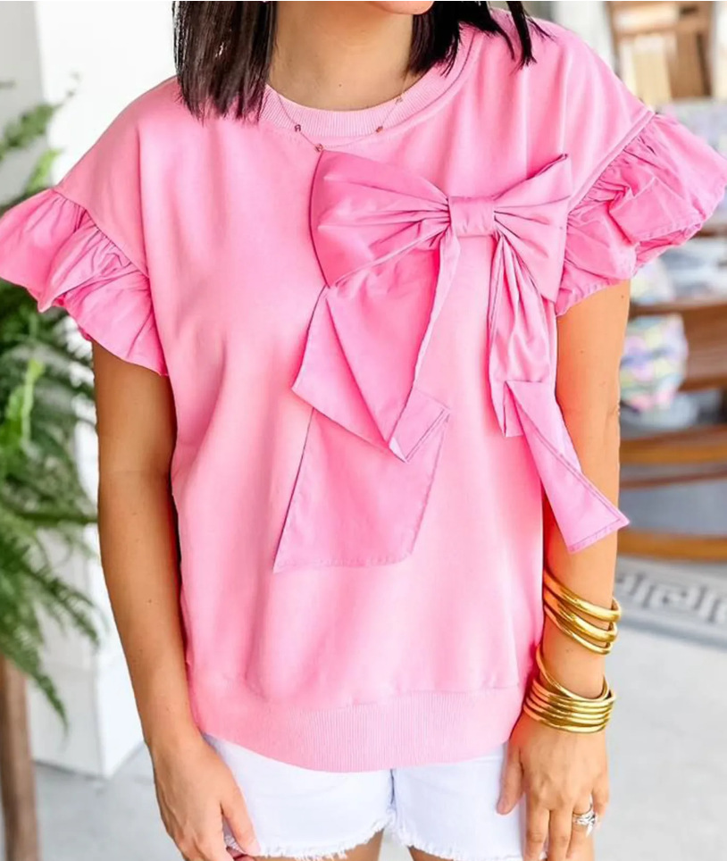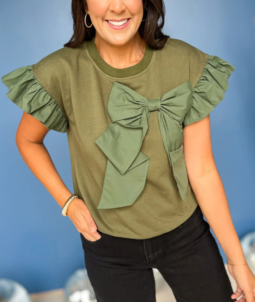 Women's Contrast Color Bow Ruffle Sleeve Top