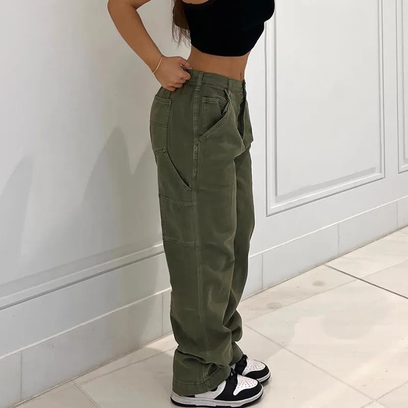Women's Denim Straight High Waist Stitching Multi-pocket Trousers
