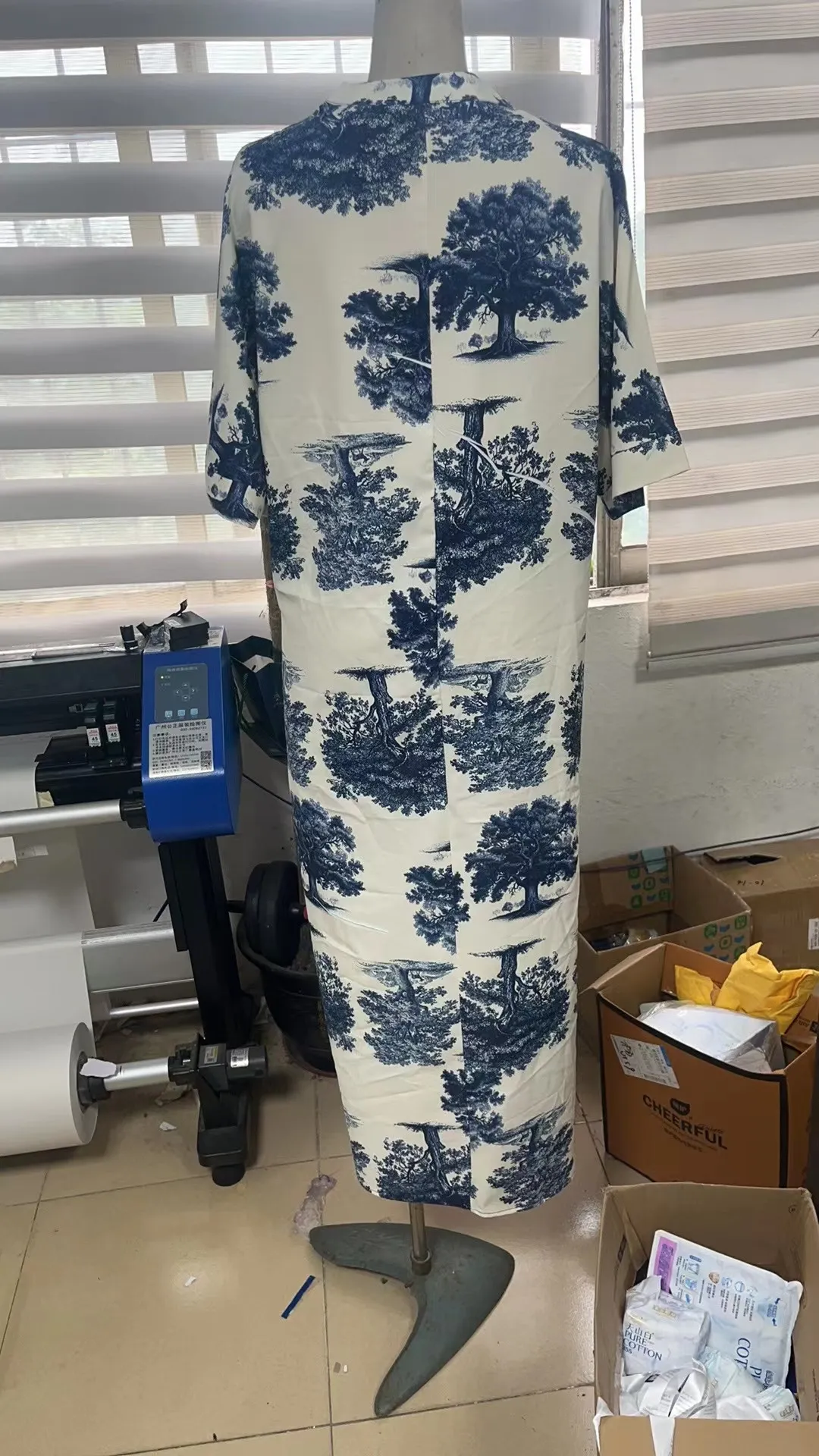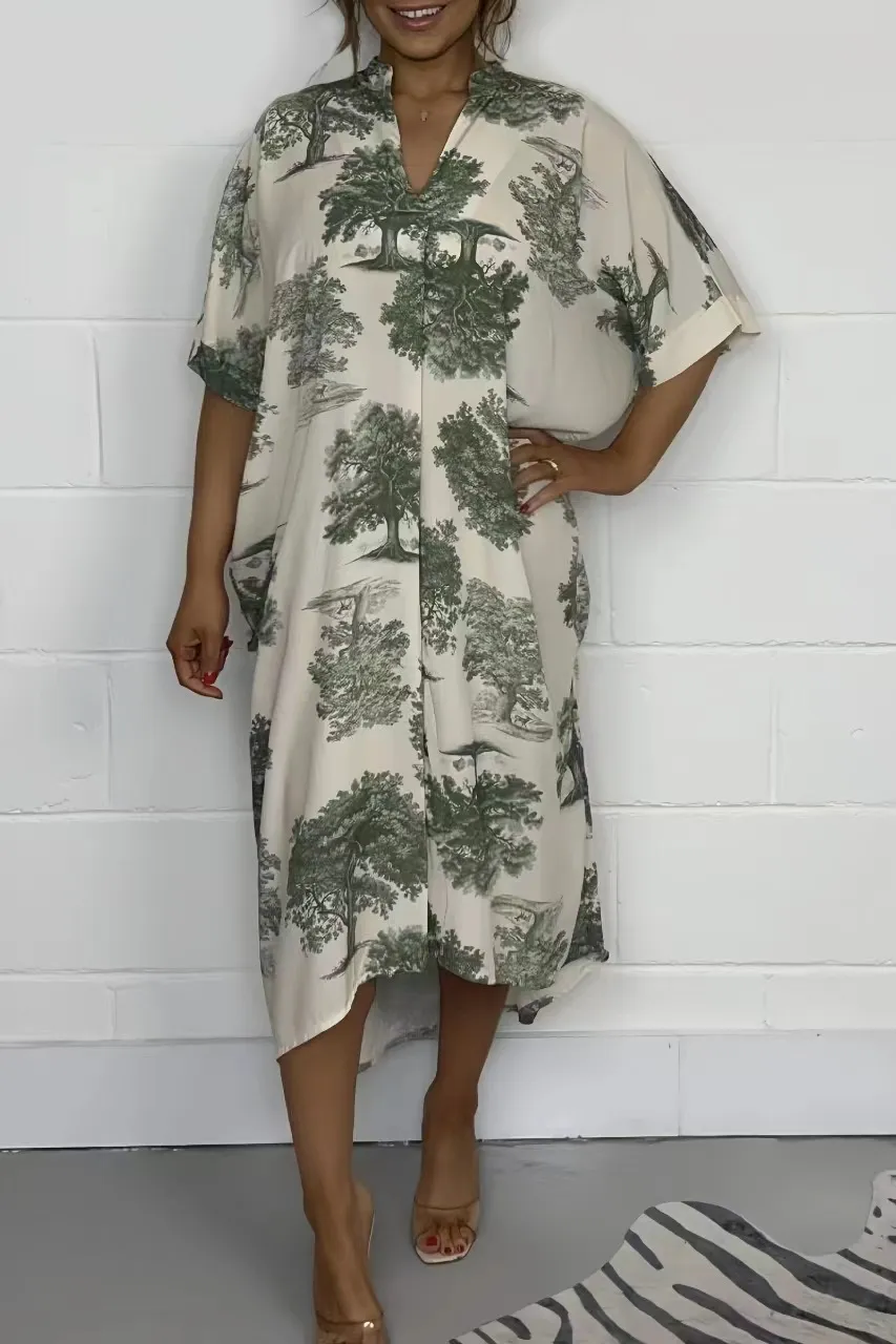 this dress features a flattering V-neckline and a relaxed, loose fit that ensures all-day wearability. The digital printing technique adds a