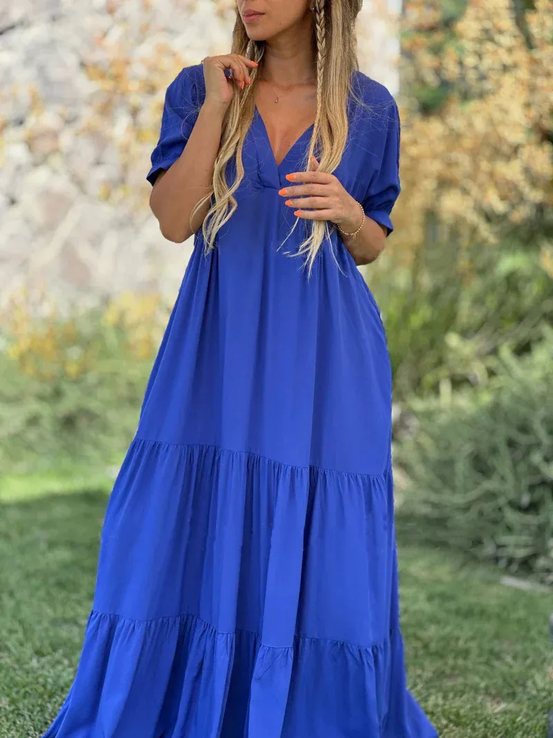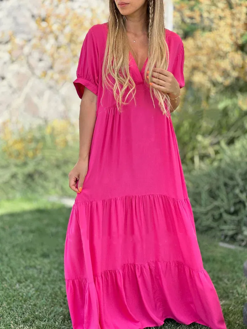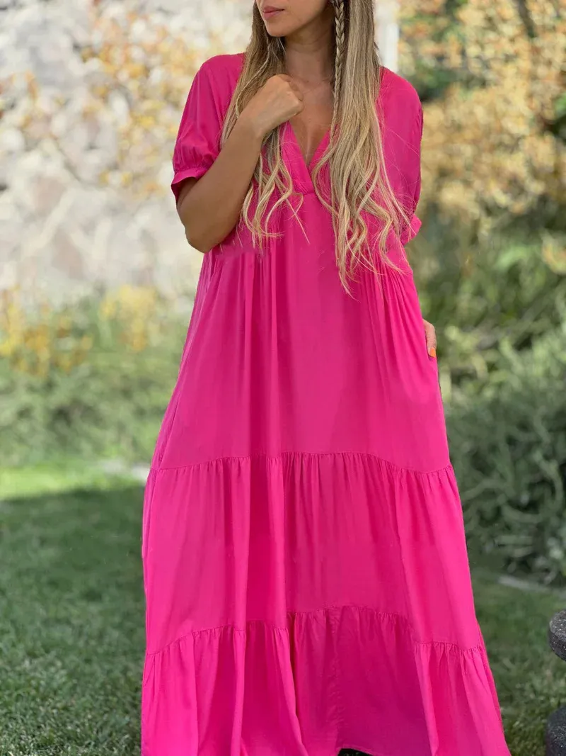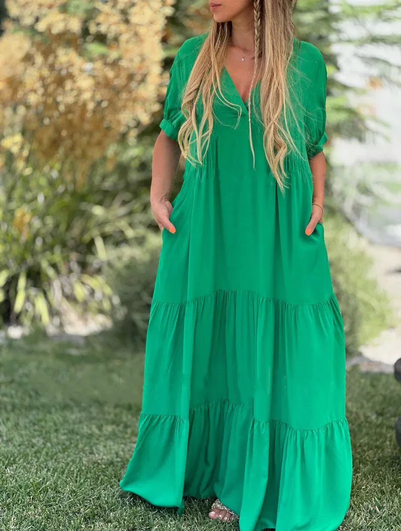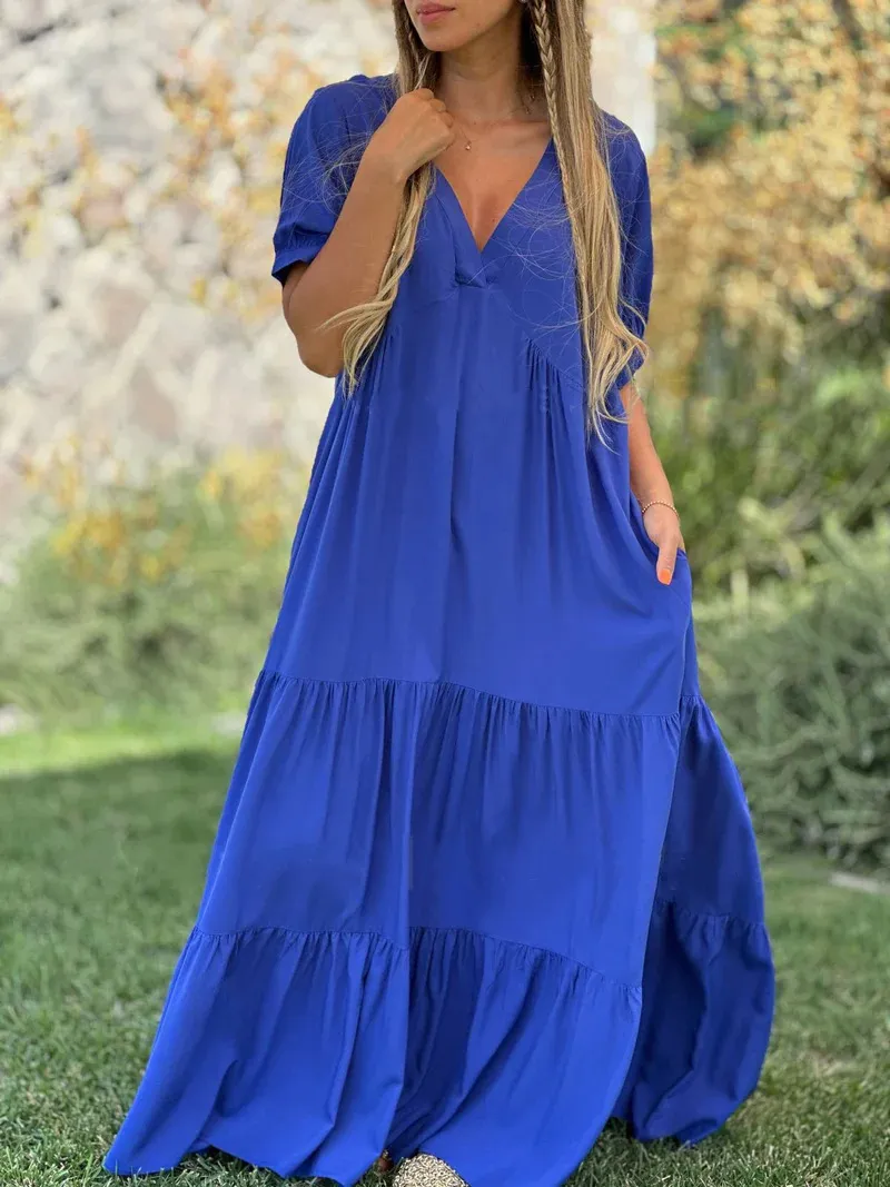 Designed for the modern woman who loves comfort without compromising on fashion, this dress is the perfect addition to any collection. The combination of a classic V-neck and a relaxed, long silhouette provides an effortlessly elegant look that suits a variety of occasions. Whether you're on vacation, enjoying a weekend brunch, or attending a casual event, the Women's Fashion Casual V-Neck Long Dress offers the perfect balance of comfort, style, and sophistication.