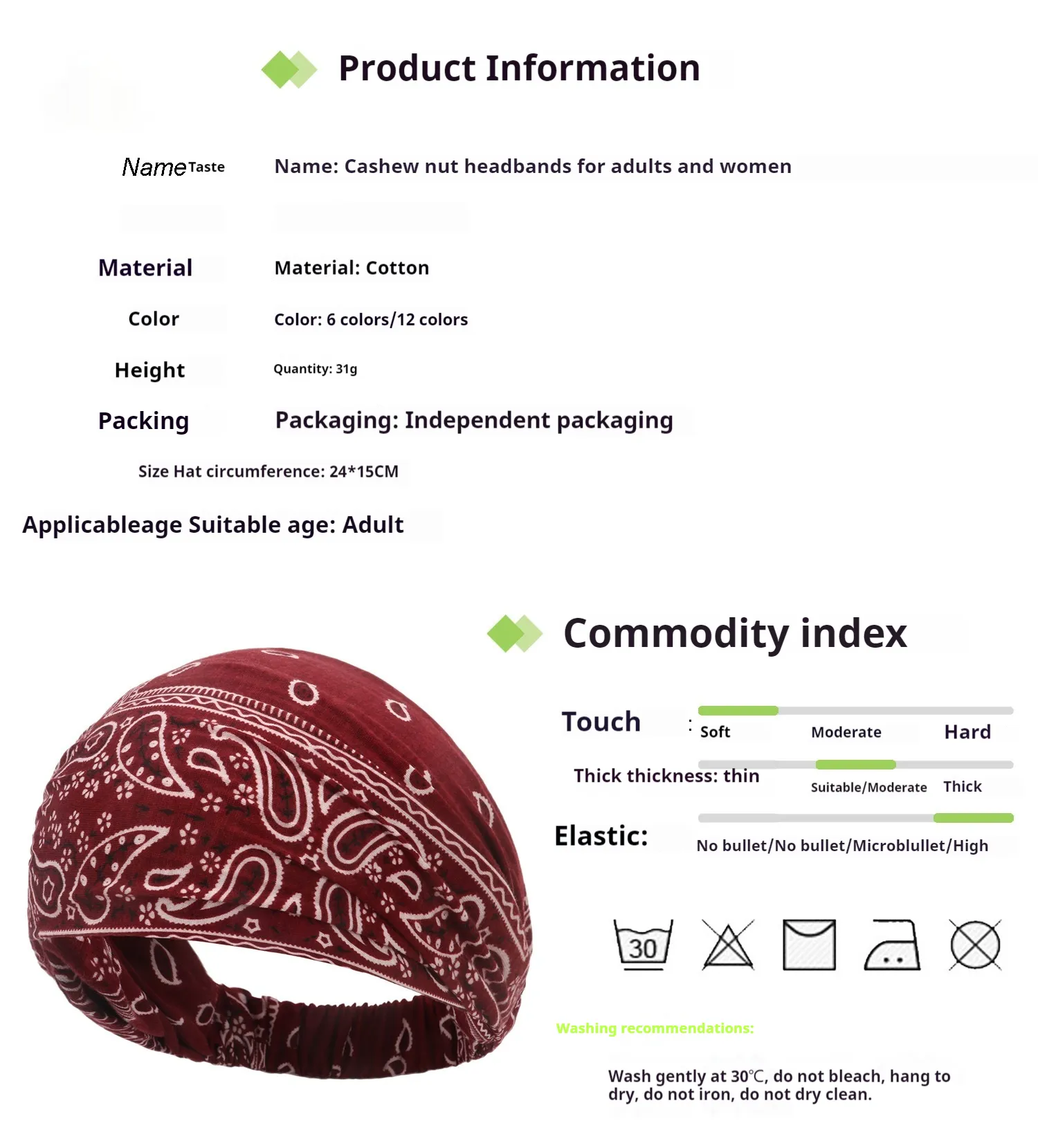 Color: Black cashew wide hair band, White cashew wide hair band, red cashew wide hair band, wine red red cashew wide hair band, sky blue