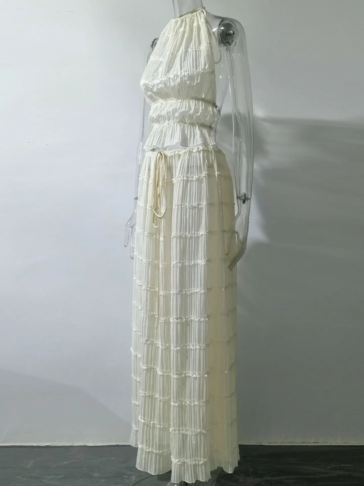 Step into summer with elegance and style with this Women's Halter Neck Long Skirt Set, a chic 2-piece outfit that combines a trendy halter neck top with a flowing, folded maxi skirt. The backless, lace-up design adds a touch of allure to the top, while the halter neckline gives a flattering silhouette that enhances the shoulders and neckline. The matching maxi skirt features a graceful, folded style that creates beautiful movement, making it ideal for beach outings, summer gatherings, or casual outdoor events.