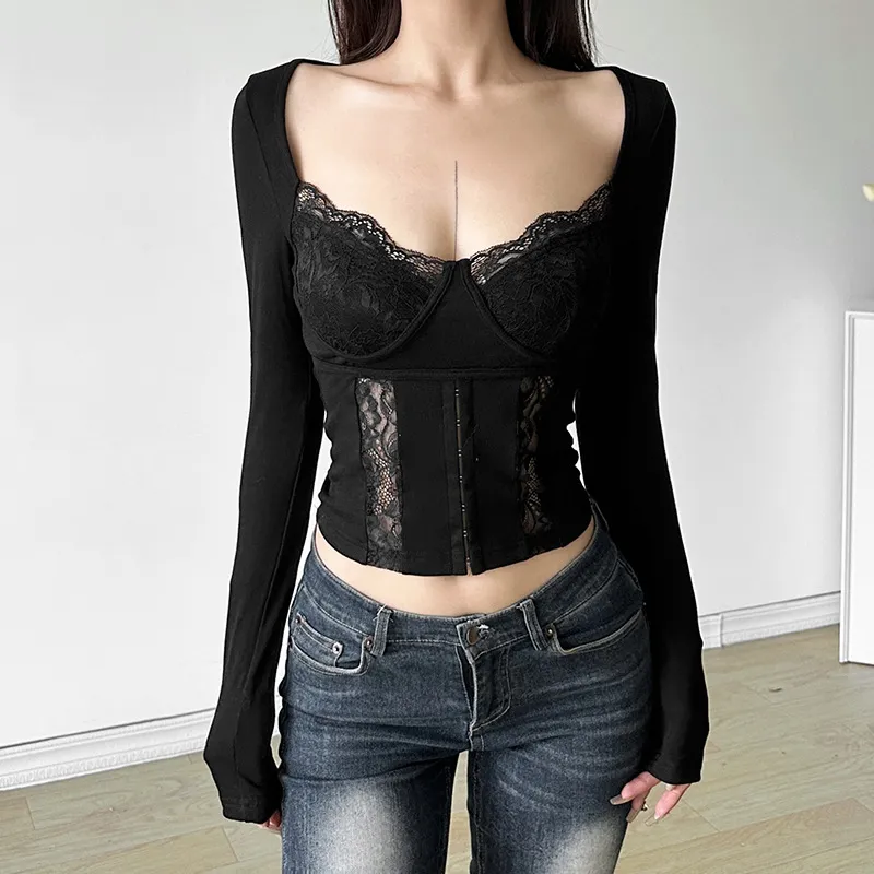 Crafted from high-quality fabric with intricate lace details, this slim-fit top hugs your body in all the right places, providing a sleek, feminine look. The lace stitching adds a delicate touch, elevating the overall design and making it perfect for both casual and more formal occasions. The square collar not only enhances the top's modern, fashionable appeal but also frames your face beautifully, adding structure to the overall silhouette.