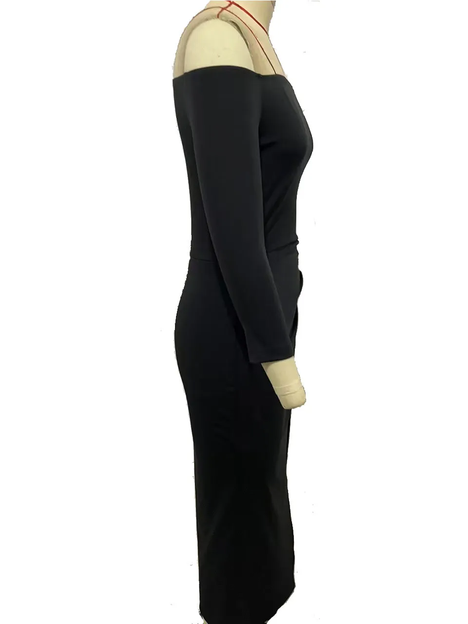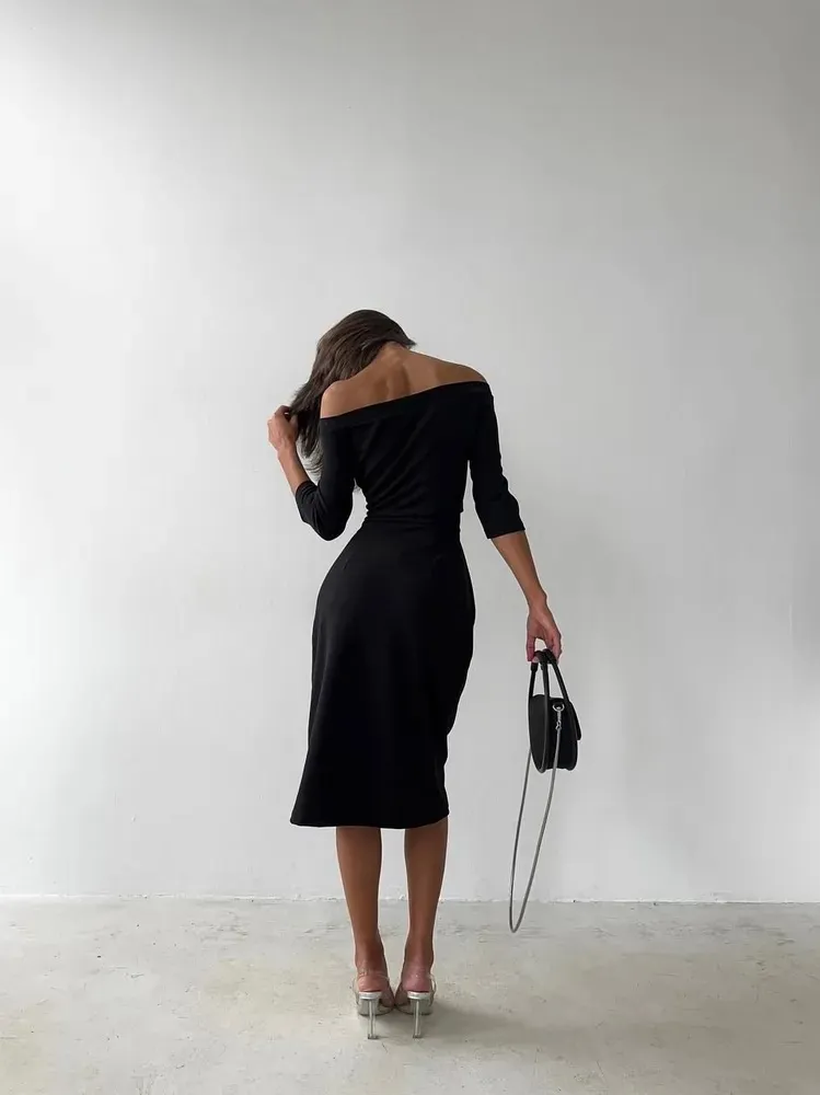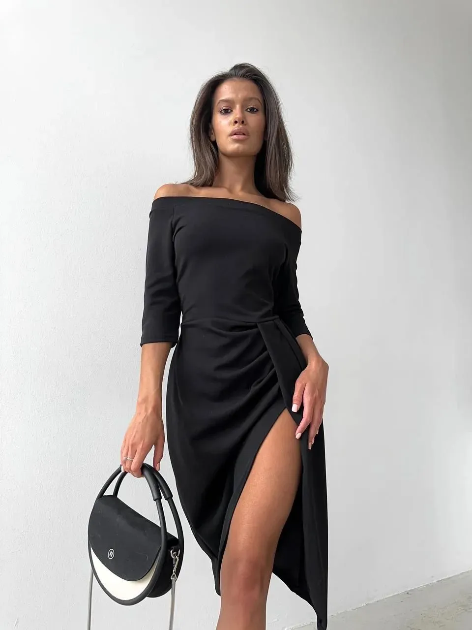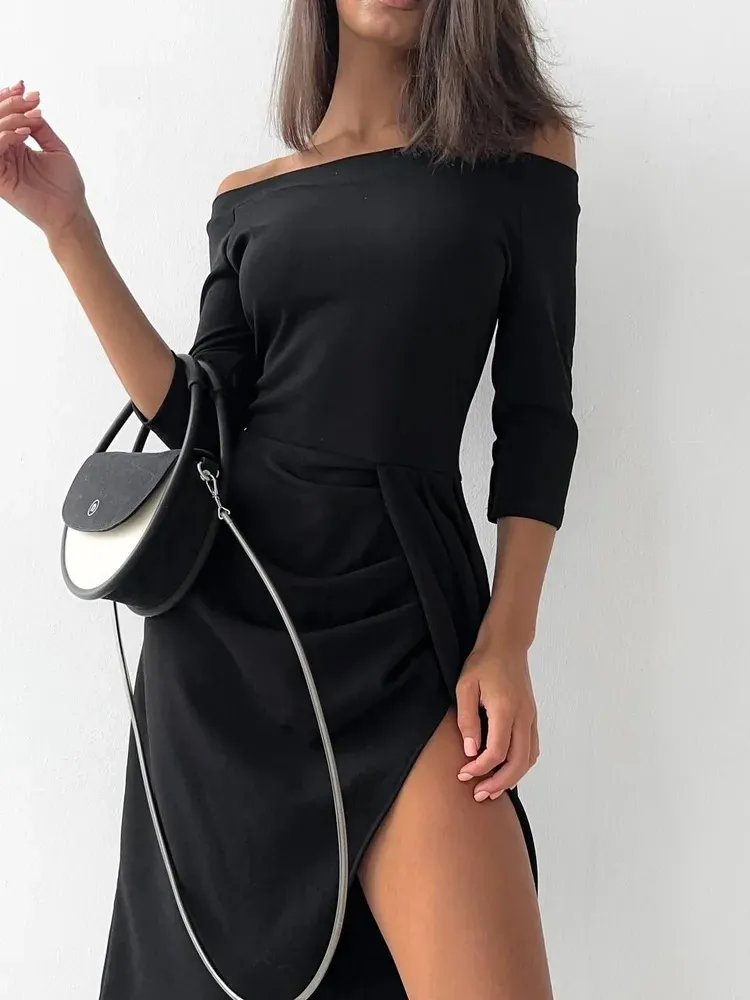 Step into timeless elegance with the Women's Off-Neck Long Sleeve Waist Slit Dress, a perfect combination of chic style and sophisticated design. This stunning dress features an off-neck neckline that beautifully frames the shoulders and collarbone, adding a touch of sensuality to the overall look. The long sleeves provide both coverage and a refined silhouette, making this dress ideal for cooler evenings or formal events. Designed to flatter, the fitted waist emphasizes your figure, while the thigh-high slit adds a subtle yet alluring touch, allowing for ease of movement and an extra hint of glamour.