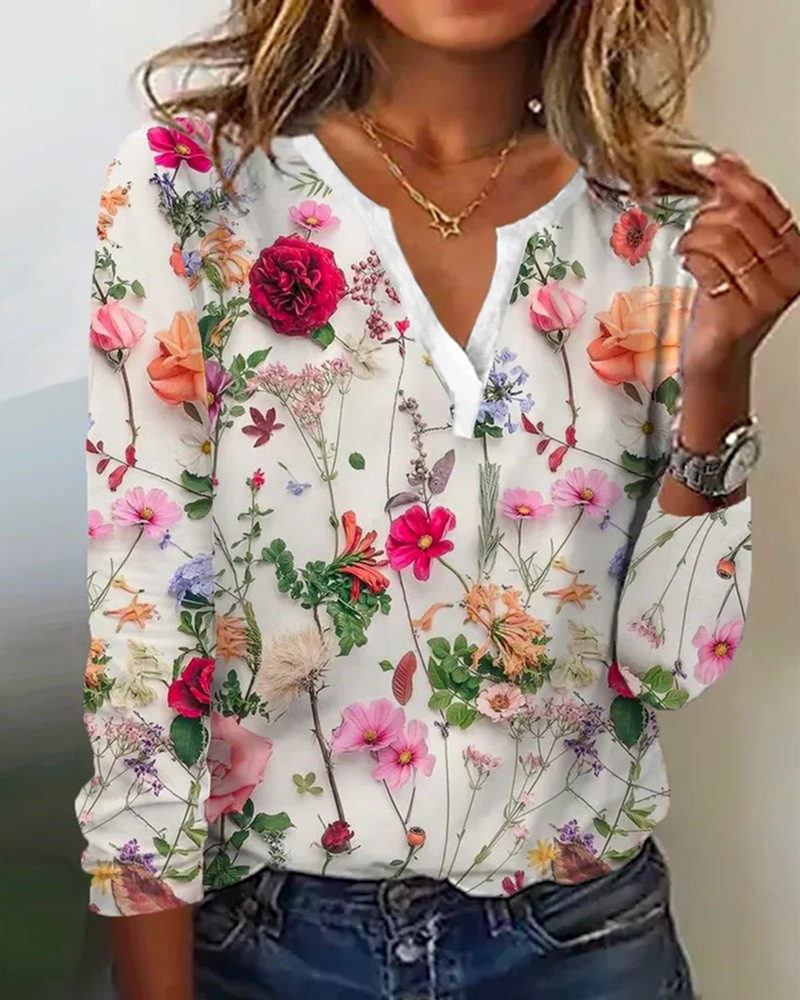 Women's Printed V-neck Long-sleeved T-shirt Top