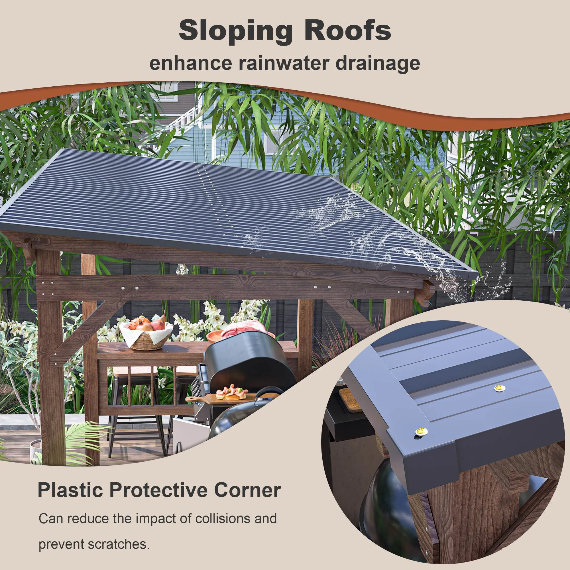 The sturdy wooden frame provides reliable support, while the metal roof offers enhanced protection from sun, rain, and other weather