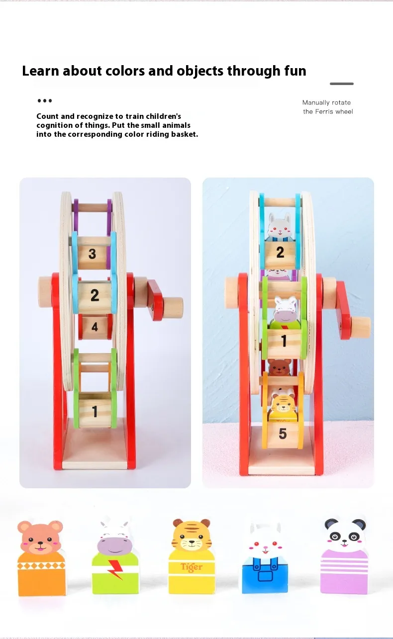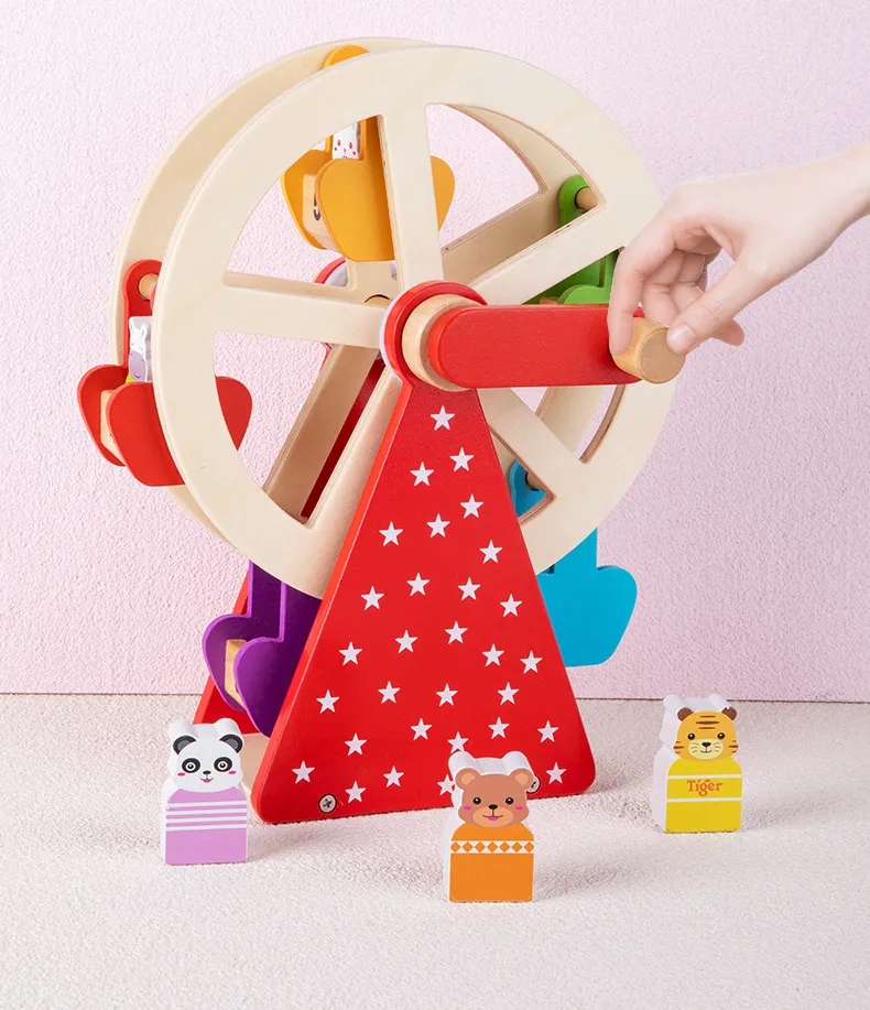 Early childhood education relies heavily on hands-on, sensory experiences, and the Wooden Animal Hand Ferris Wheel excels in providing just that. Here’s how this toy contributes to your child’s development: