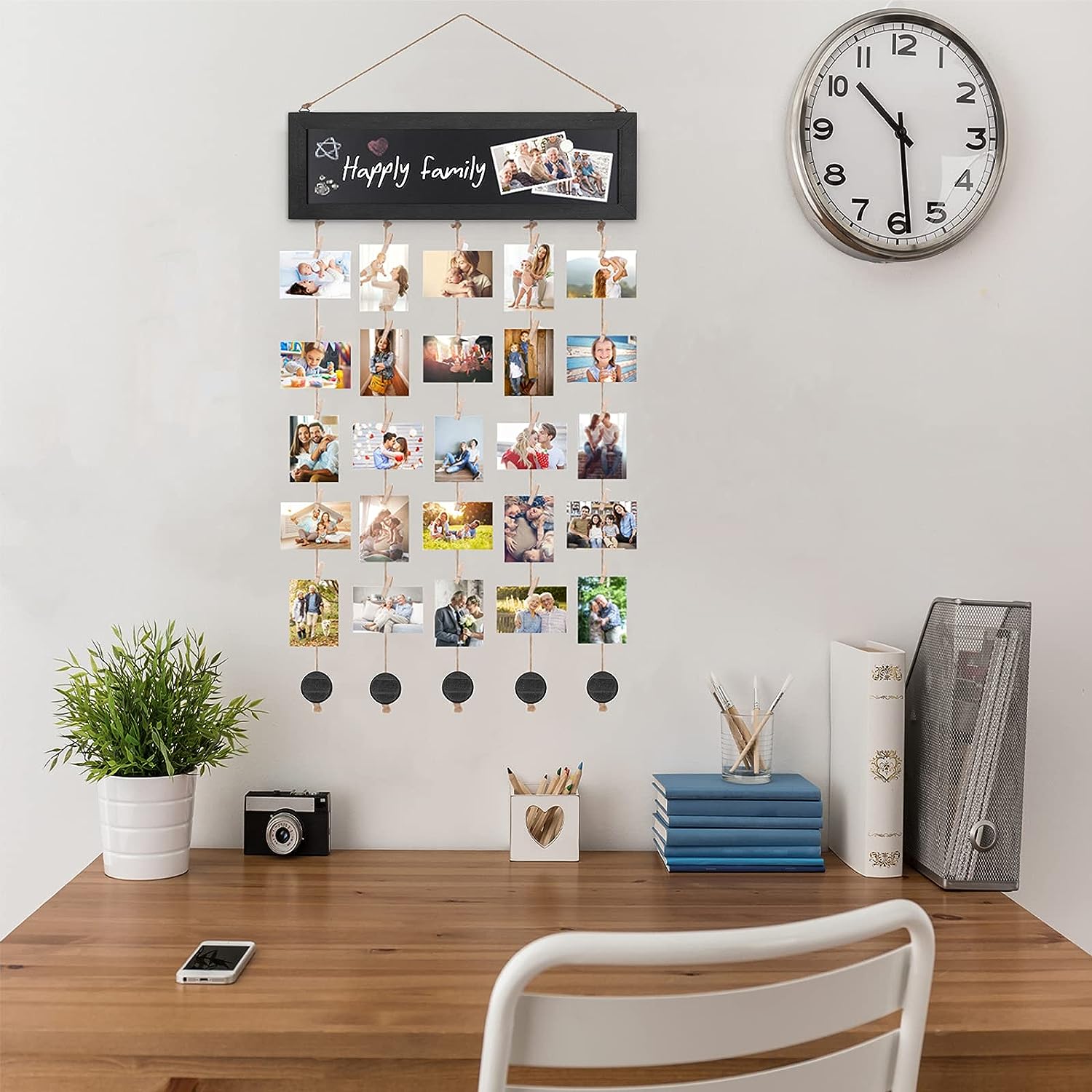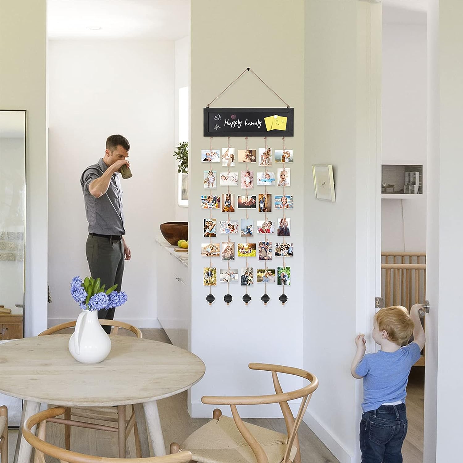 🐬Perfect Way to Display Multiple Photos: Simple design collage photo frames with 30 clips, 5 hemp rope, 3 magnets and 1 blackboard, you can cut the length of hemp rope as you want, which satisfies simple DIY design. What's more, it's easy to change the picture or cards with the 30 clips