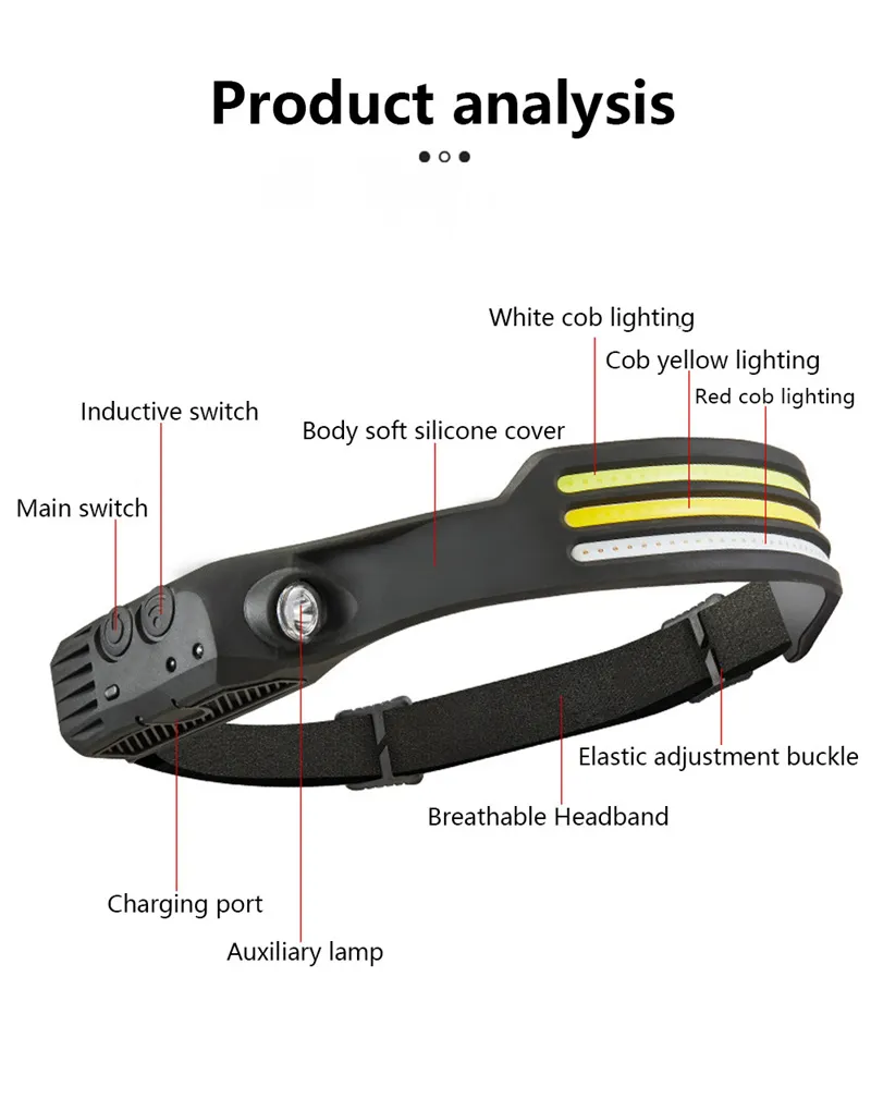 1. Full view ultra-light induction headlamp: far and near dual light comfortable Wearingtypebe-c fast charging.