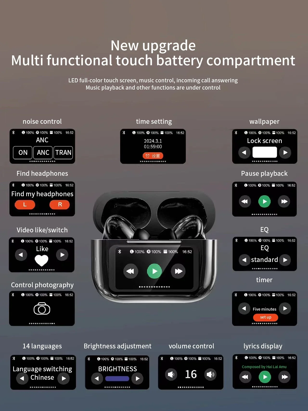 The sleek charging case features an LED screen that displays real-time information.