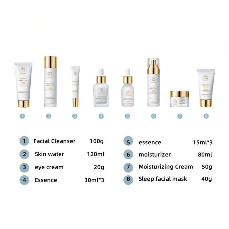 Includes cleanser, toner, essence, serums, eye care, emulsion, and cream.