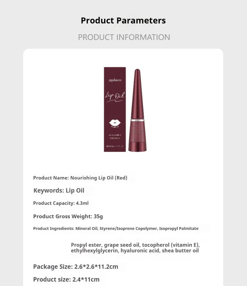Zephoco Lip Oil. Provides long-lasting hydration and plumps lips for a full, glossy, and nourished finish. Non-sticky and comfortable for everyday wear.