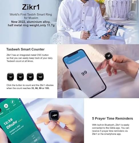 Furthermore, the multifunction tasbeeh ring tracks various forms of remembrance, not just the number of times a phrase is repeated. It can be customized to track specific prayers and supplications, offering flexibility and adaptability. The Muslim gadget also integrates with the ZikrZen app’s prayer reminder system, ensuring that you never miss a prayer, even during busy or travel-filled days.